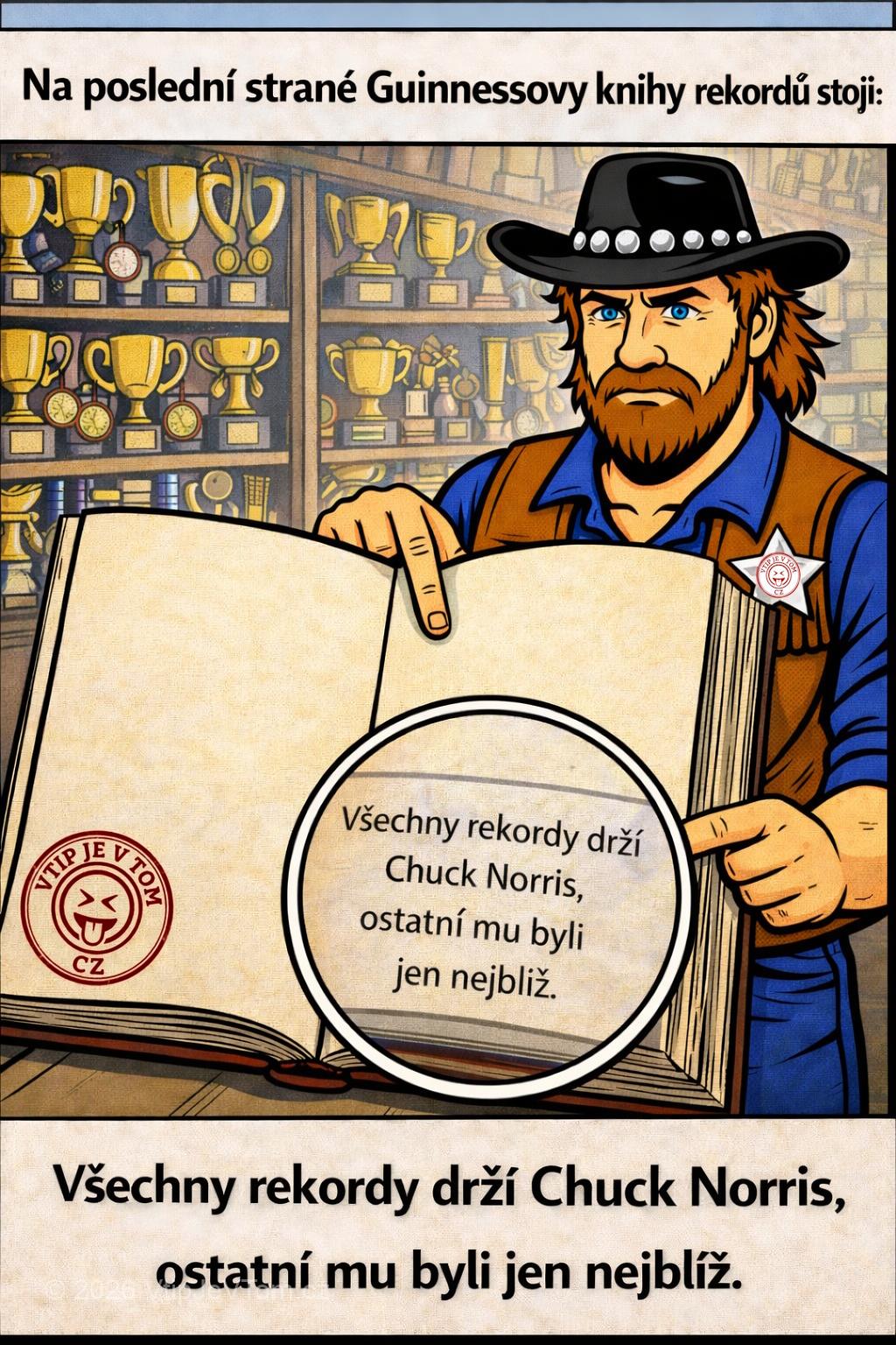 Na poslední stránce Guinnessovy knihy rekordů malým písmem uvedeno že všechny zde uvedené rekordy drží Chuck Norris a zde zapsaní lidé jsou prostě ti, kteří mu byli nejblíž.