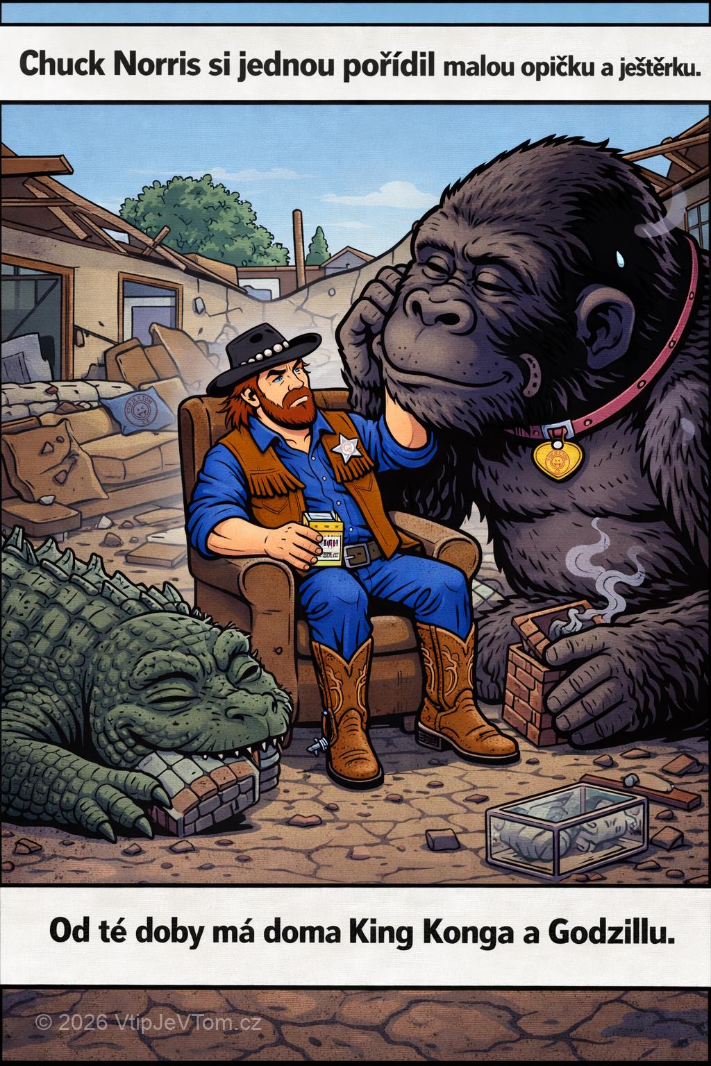 Chuck Norris se jednou rozhodl, že si pořídí domácí mazlíčky, konkrétně malou opičku a roztomilou ještěrku. Od té doby má doma King Konga a Godzillu.