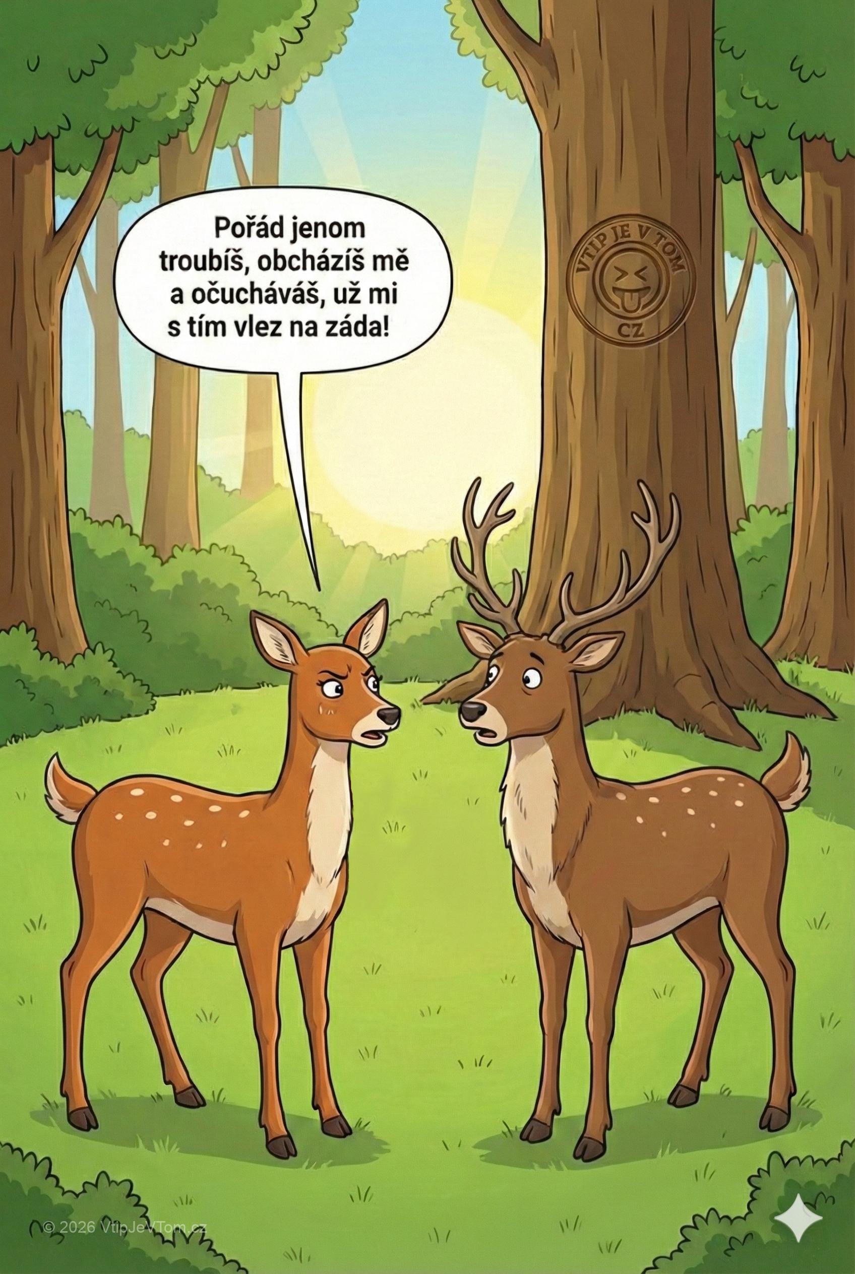 Povídá v lese nervózní laň jelenovi: „Pořád jenom troubíš, obcházíš mě a očucháváš, už mi s tím vlez na záda!”
