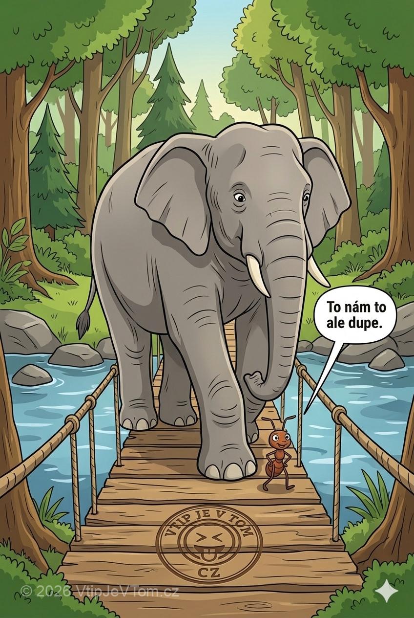 Jdou slon a mravenec po mostě a mravenec říká: „To nám to ale dupe.”