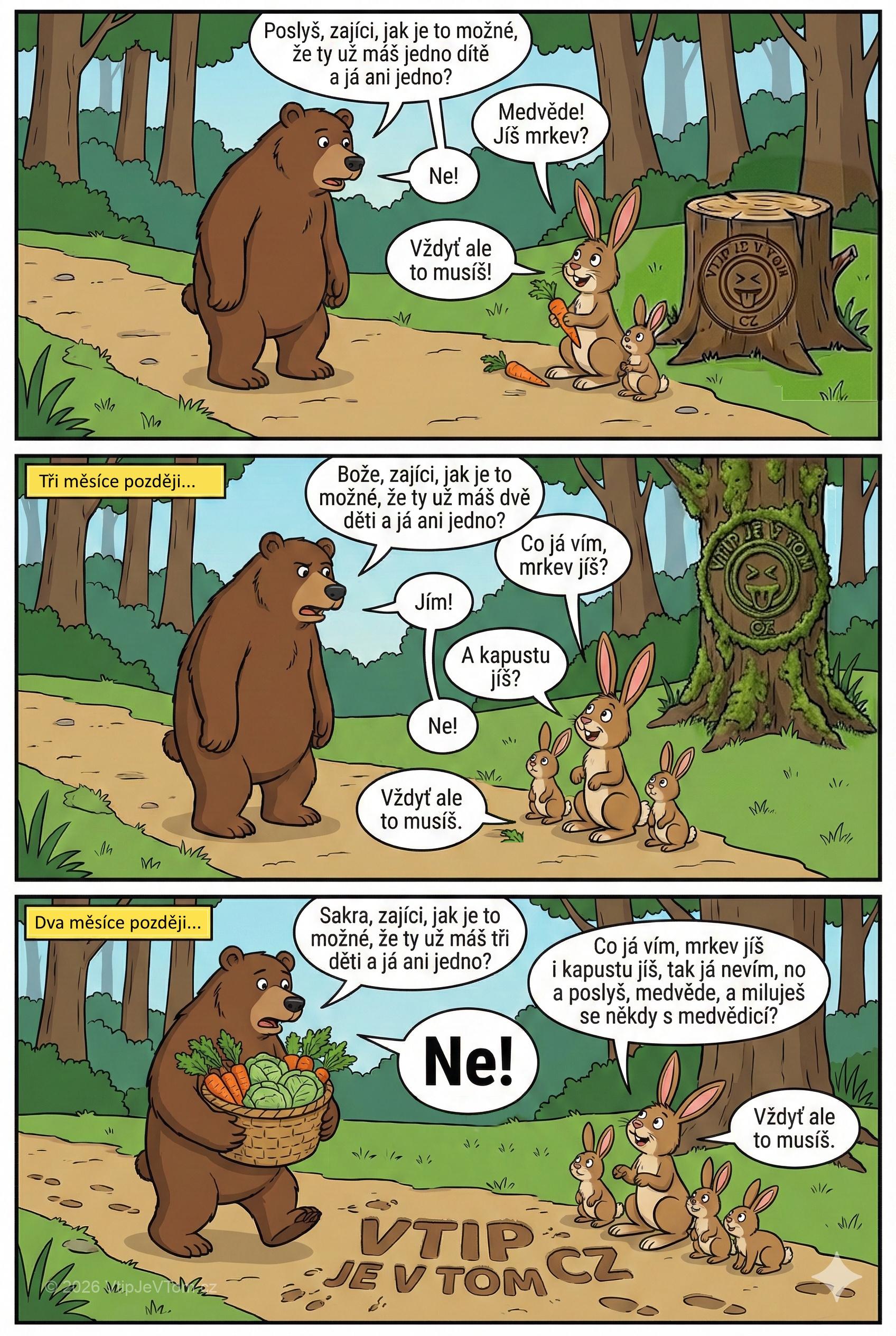 Potkají se o tři měsíce později a medvěd se ptá zajíce: „Bože, zajíci, jak je to možné, že ty už máš dvě děti a já ani jedno?”