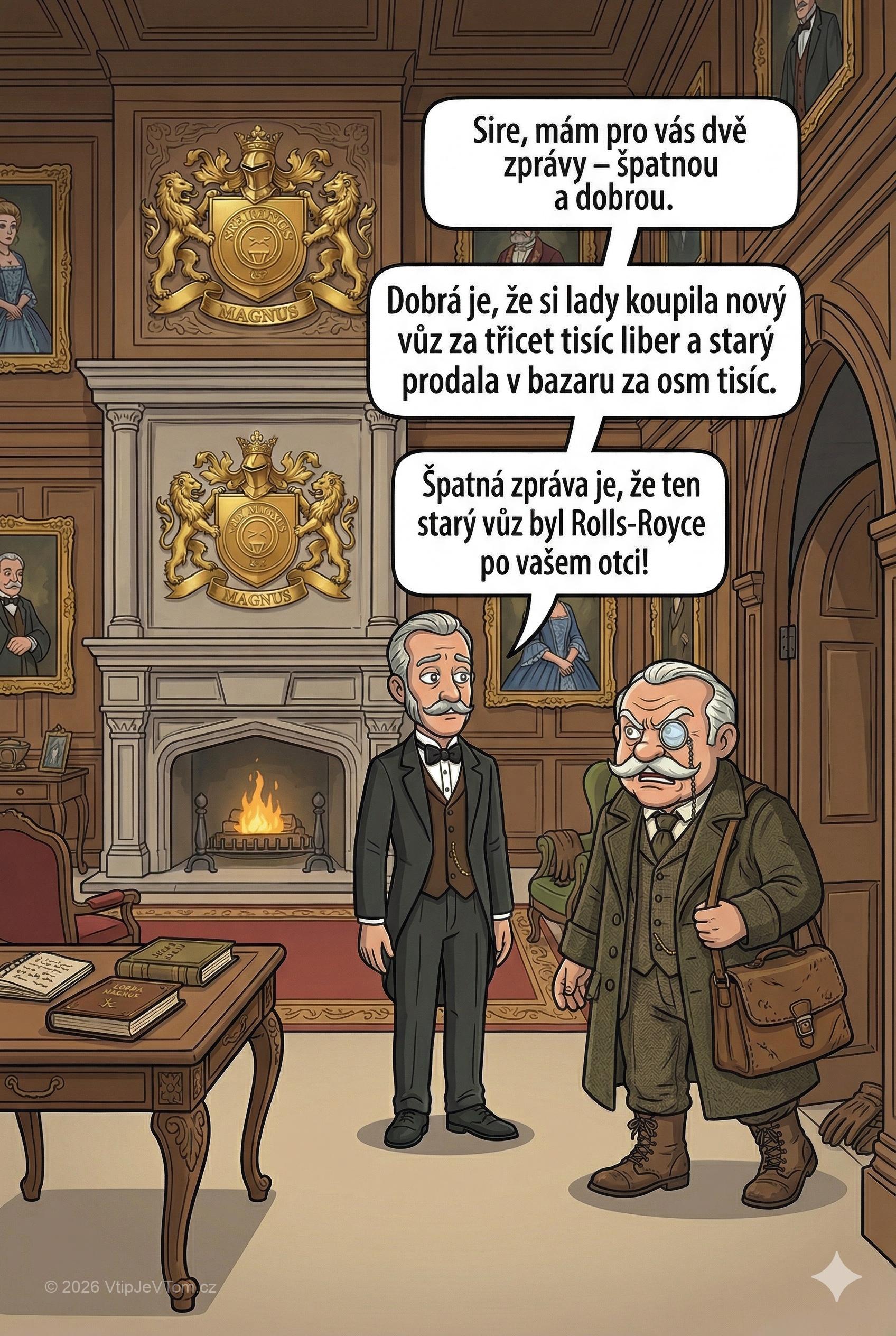 Sluha Jean oznamuje lordu Magnusovi, který se právě vrátil z dlouhé cesty: „Sire, mám pro vás dvě zprávy – špatnou a dobrou. Dobrá je, že si lady koupila nový vůz za třicet tisíc liber a starý prodala v bazaru za osm tisíc. Špatná zpráva, že ten starý vůz byl Rolls – Royce po vašem otci!”