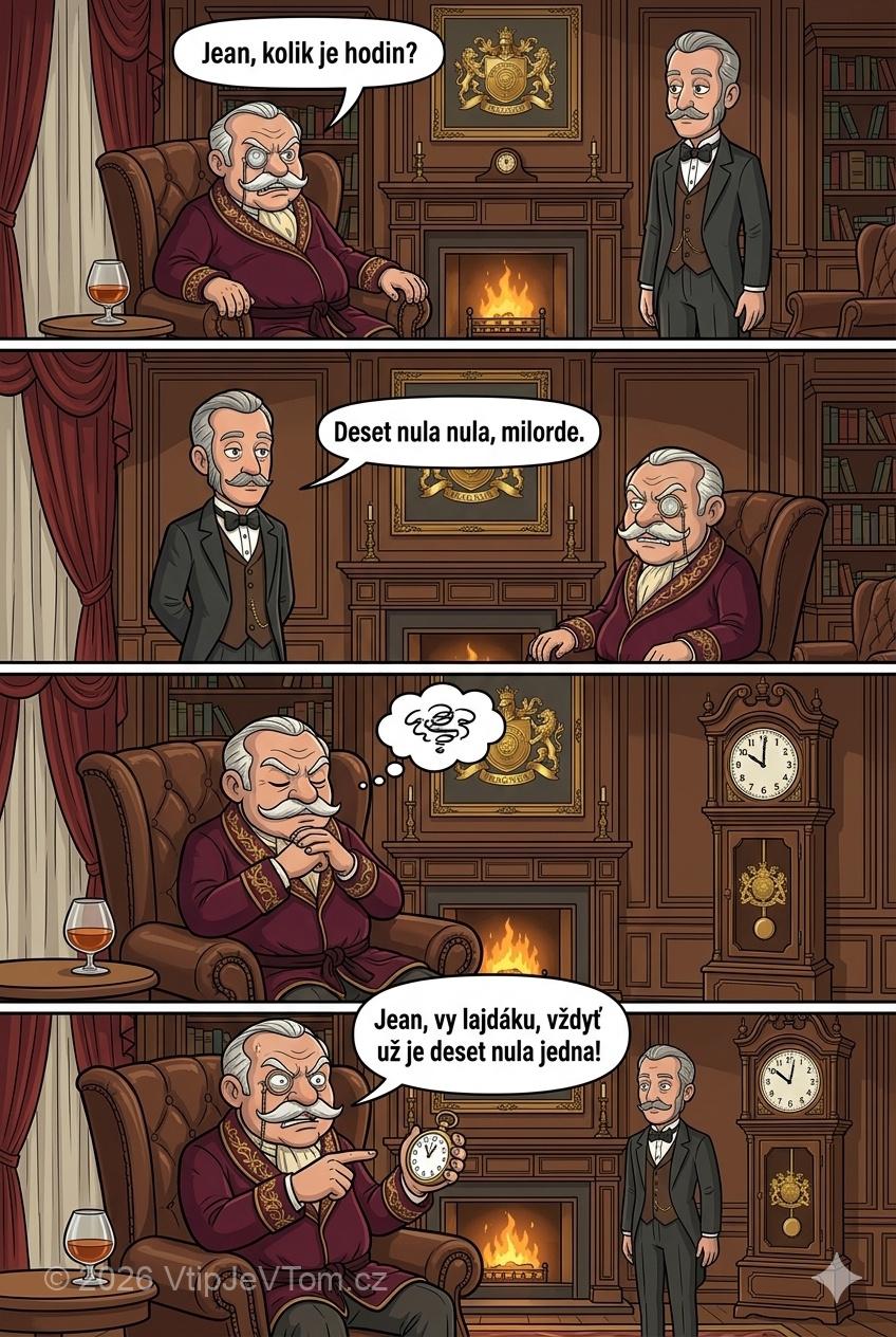 Lord Magnus se zamyslí a po pár vteřinách se podívá na hodinky: „Jean, vy lajdáku, vždyť už je deset nula jedna!”