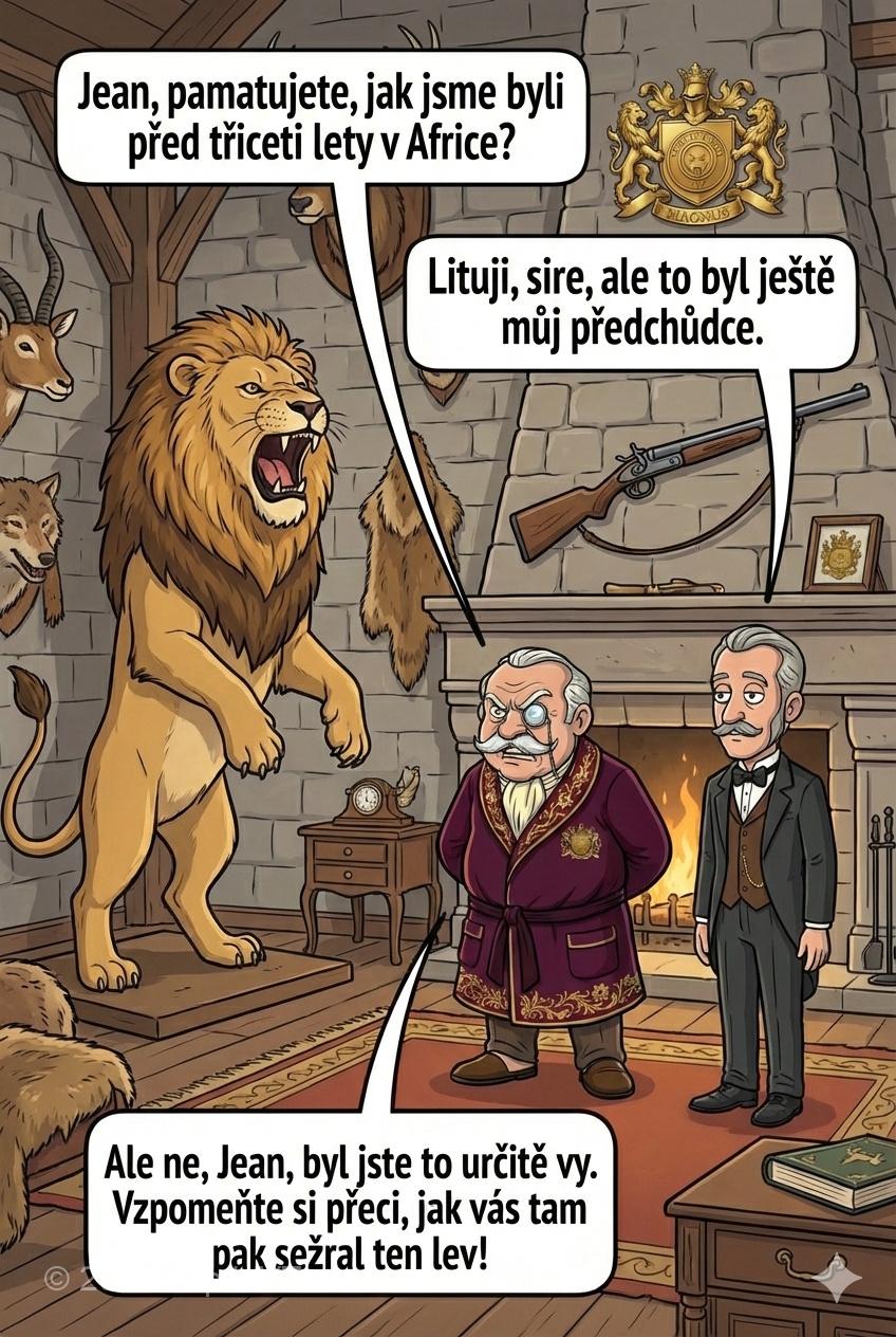 Lord Magnus: „Ale ne, Jean, byl jste to určitě vy. Vzpomeňte si přeci, jak vás tam pak sežral ten lev!“
