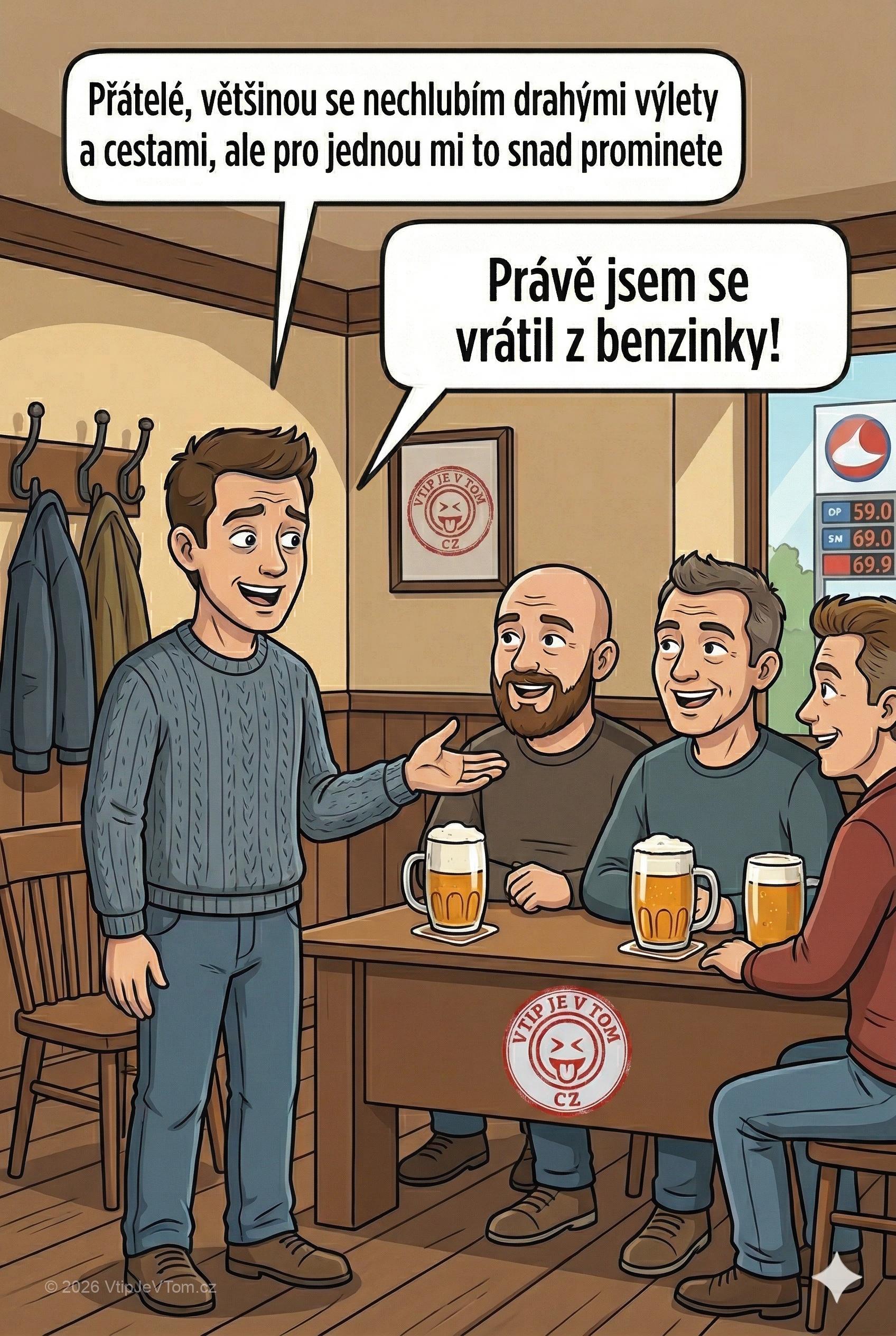 Chlapík se chlubí kamarádům v hospodě: „Přátelé, většinou se nechlubím drahými výlety a cestami, ale pro jednou mi to snad prominete. Právě jsem se vrátil z benzinky!“
