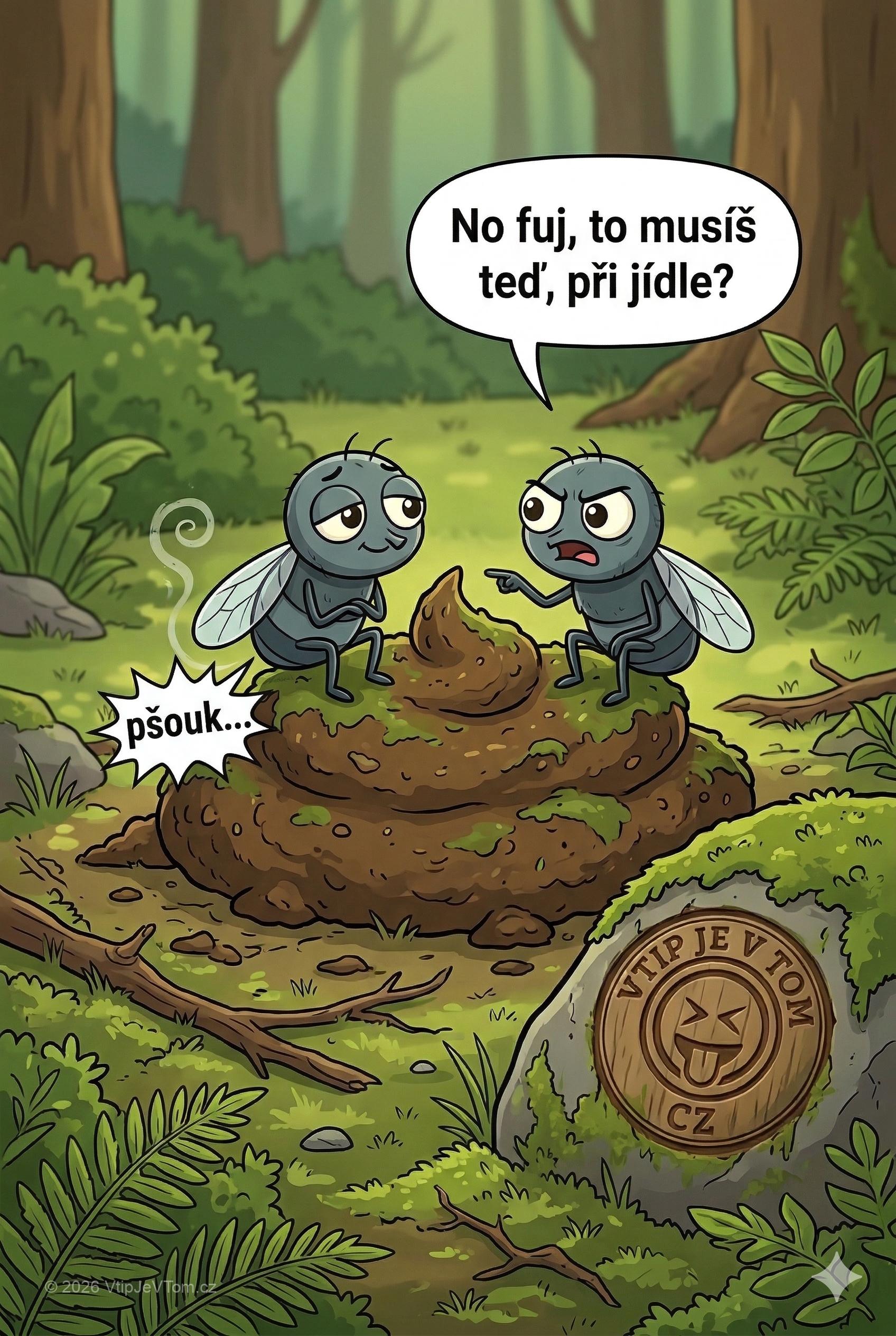 Sedí takhle dvě mouchy na lejně a jedna z nich si… prdne.