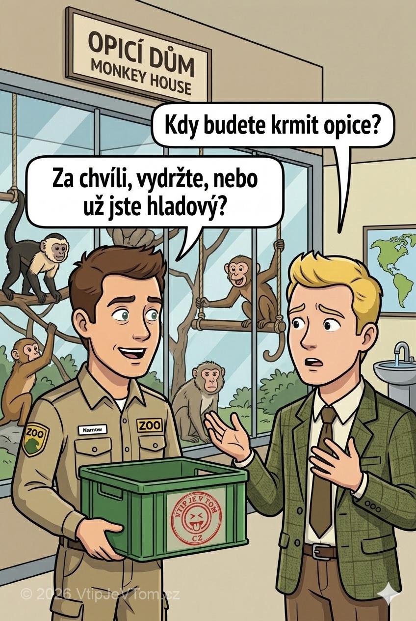 Pán se ptá zřízence v zoo: „Kdy budete krmit opice?”