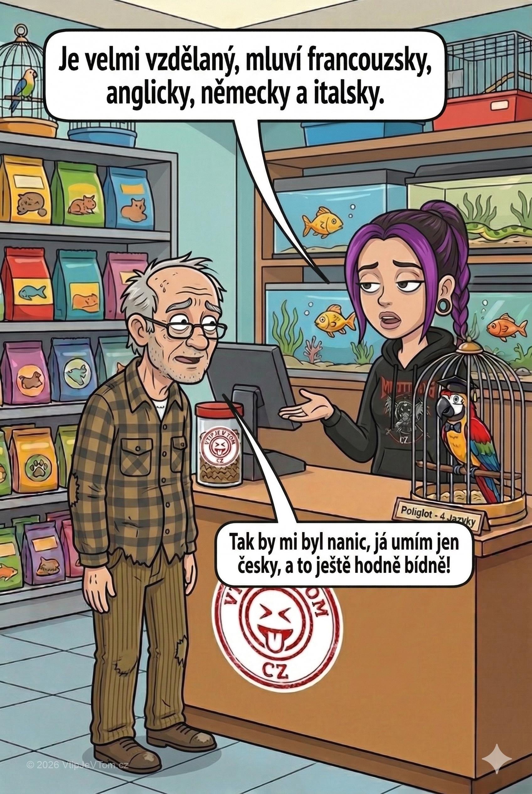 Prodavačka ho vychvaluje: „Je velmi vzdělaný, mluví francouzsky, anglicky, německy a italsky.”