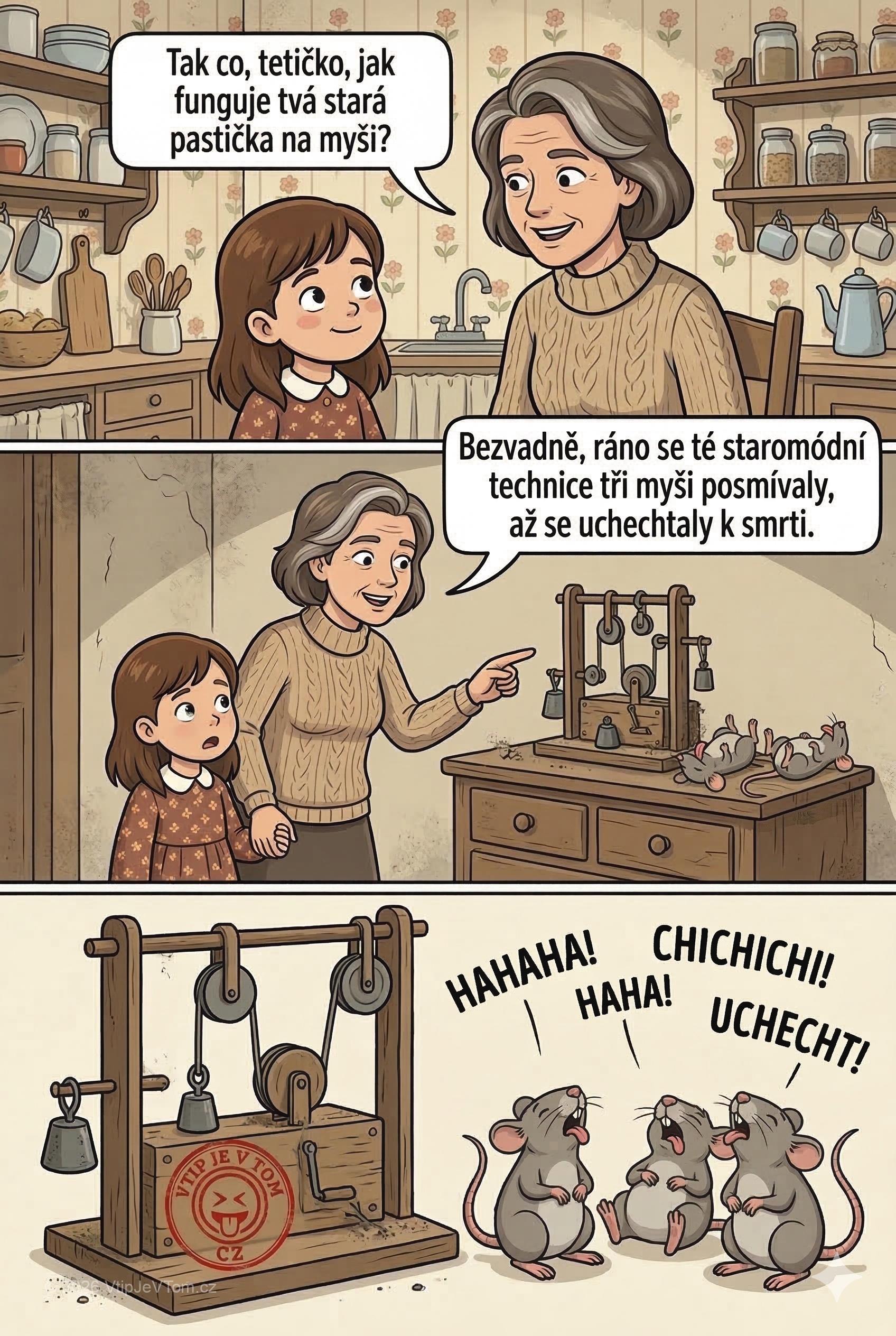 Holka se ptá tetičky: „Tak co, tetičko, jak funguje tvá stará pastička na myši?”