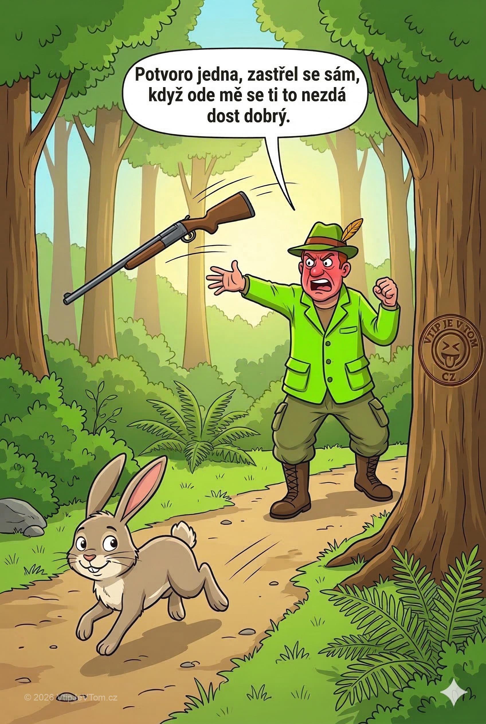 Sváteční střelec mrštil vztekle flintu po utíkajícím zajíci, na kterého dvakrát marně vystřelil: „Potvoro jedna, zastřel se sám, když ode mě se ti to nezdá dost dobrý.”