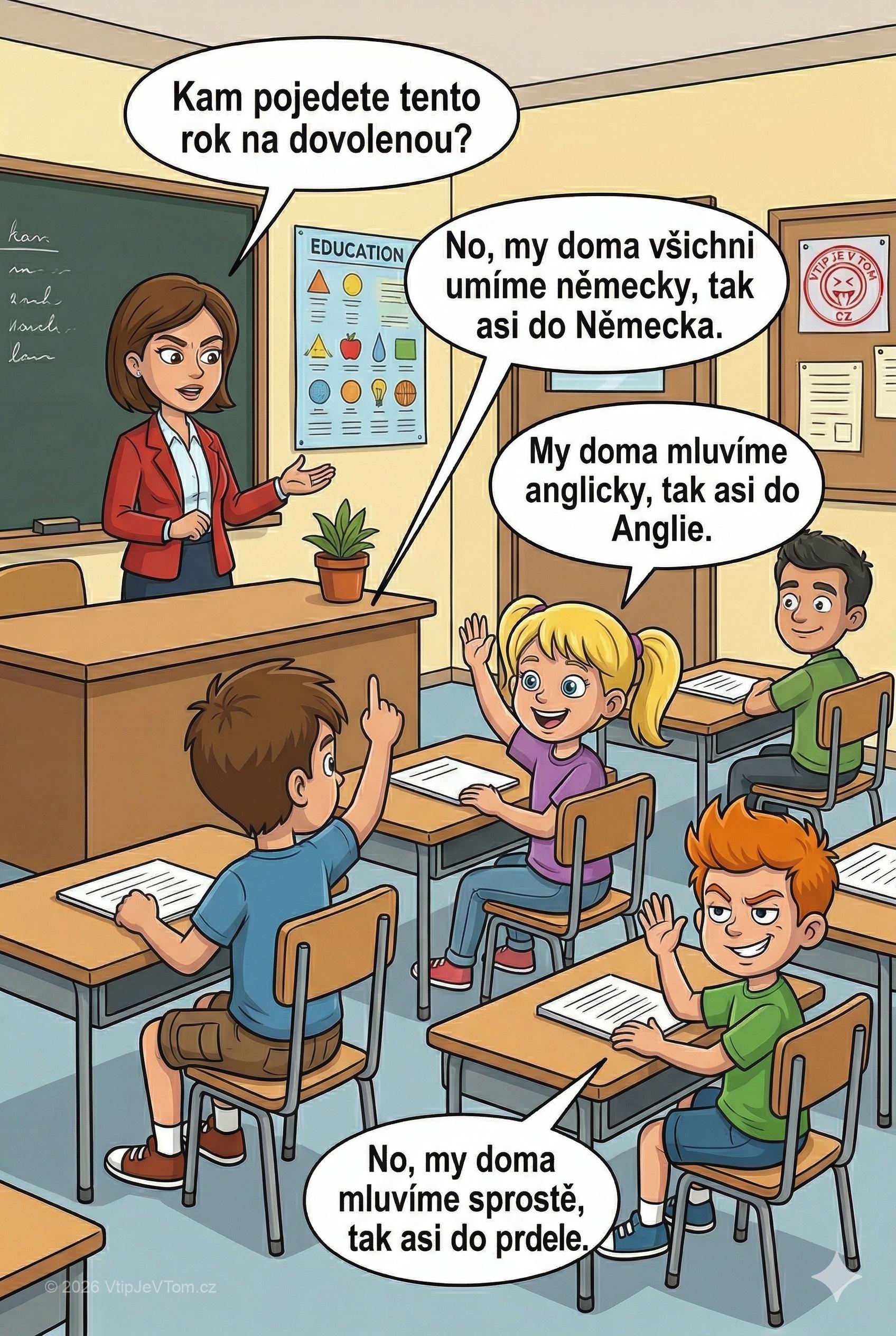Přihlásí se Anička a povídá: „My doma mluvíme anglicky, tak asi do Anglie.“