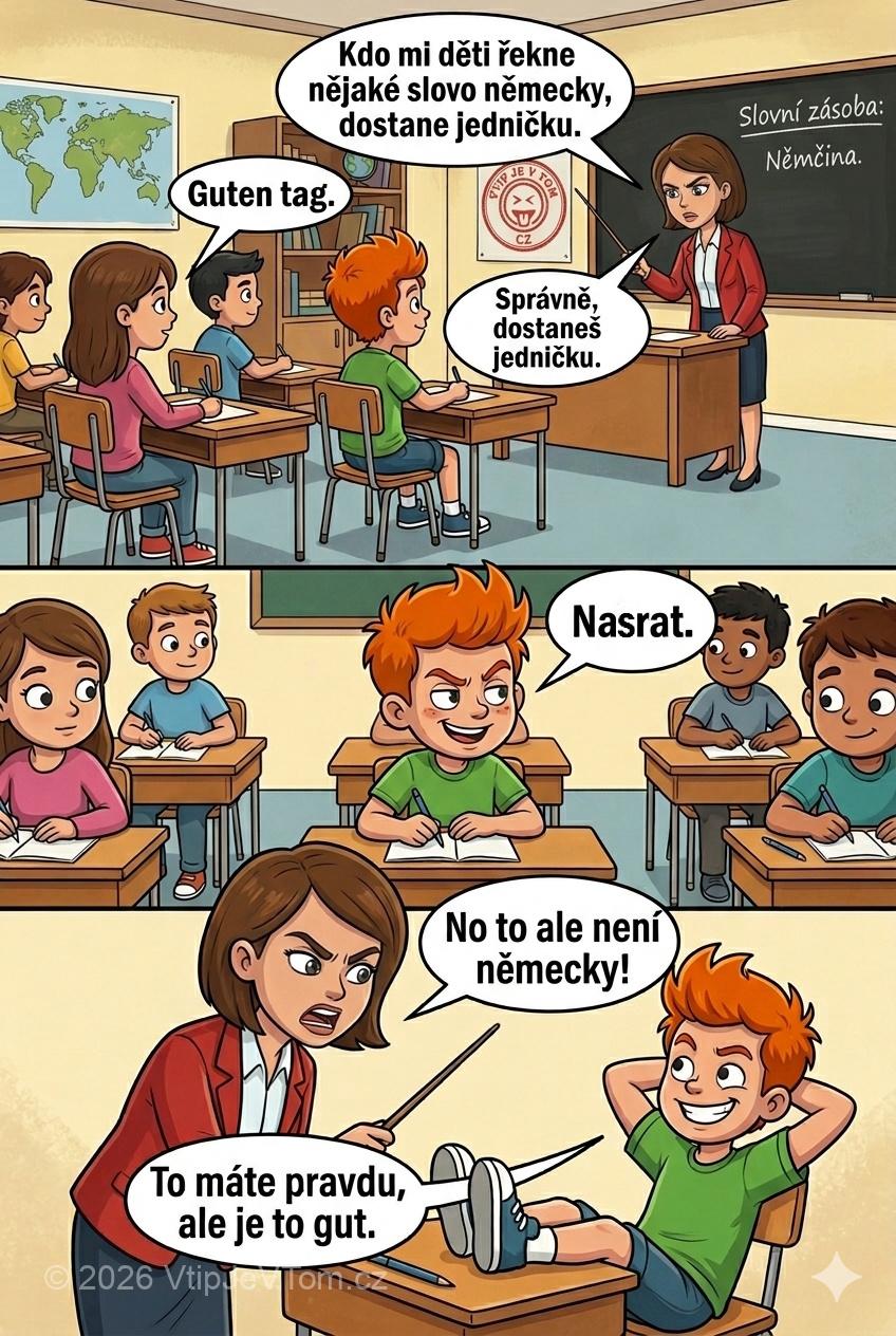 Paní učitelka povídá dětem: „Kdo mi děti řekne nějaké slovo německy, dostane jedničku.“