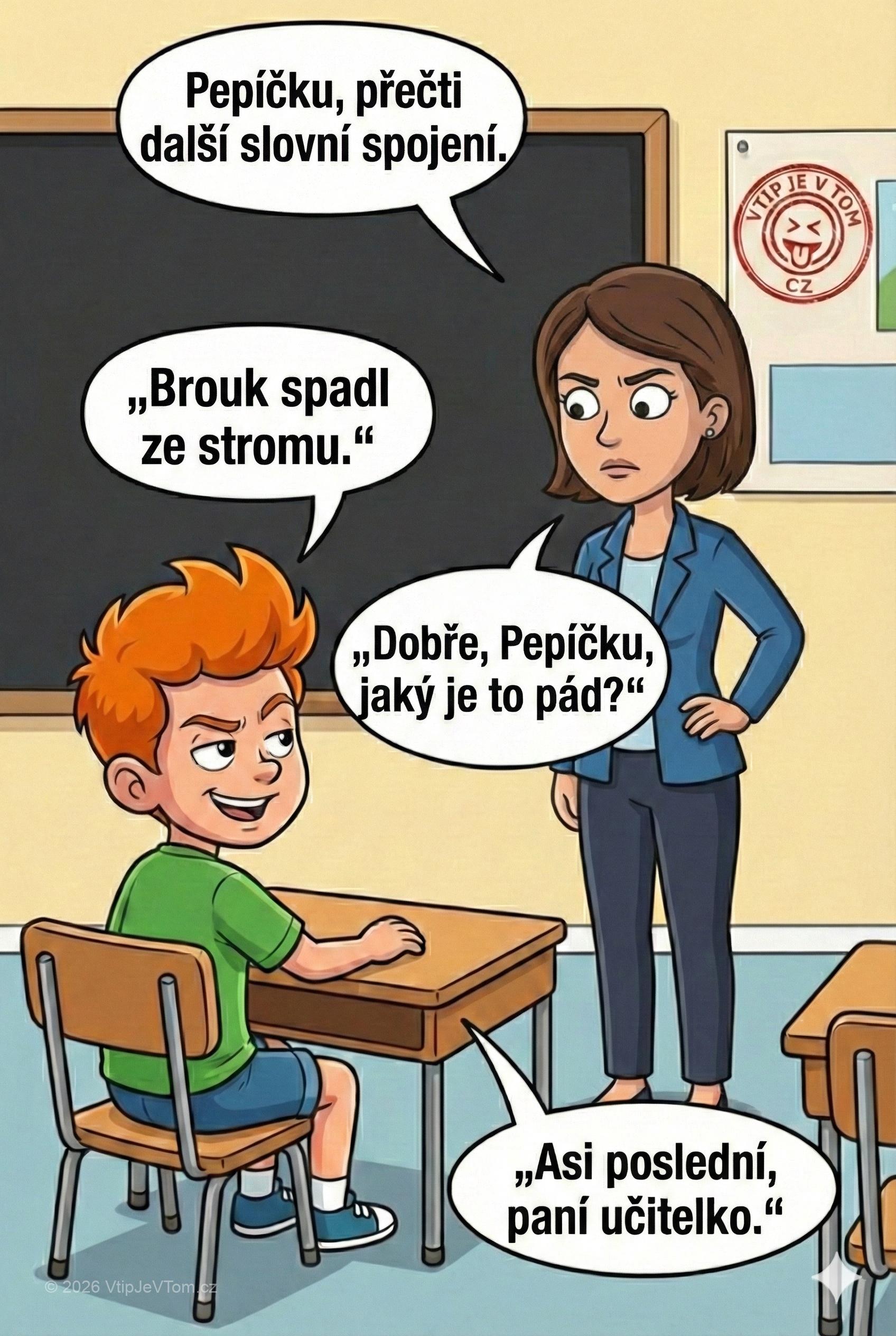 Paní učitelka: „Dobře, Pepíčku, jaký je to pád?“