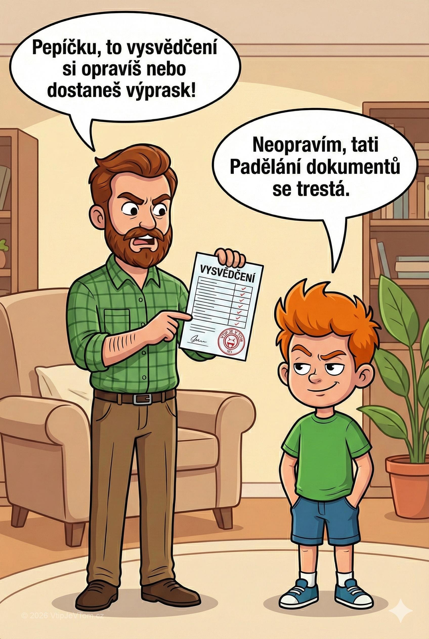 „Pepíčku, to vysvědčení si opravíš nebo dostaneš výprask!“ vyhrožuje tatínek.