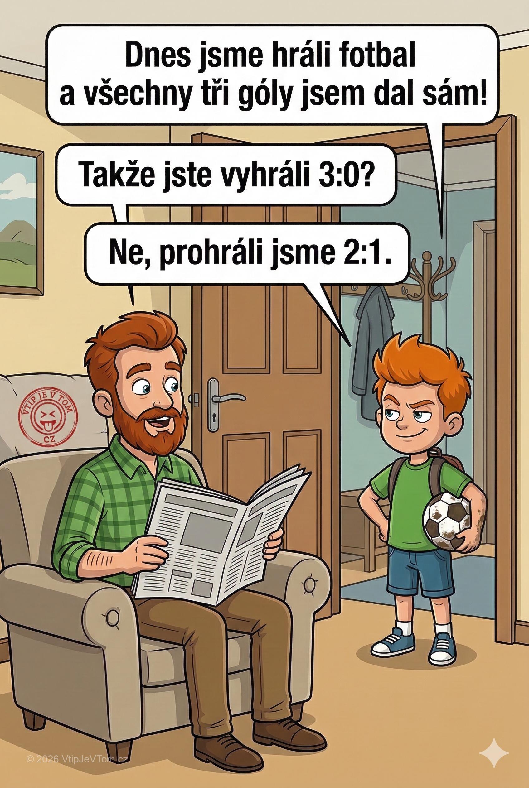 Pepíček přijde domů a říká tátovi: „Dnes jsme hráli fotbal a všechny tři góly jsem dal sám!“