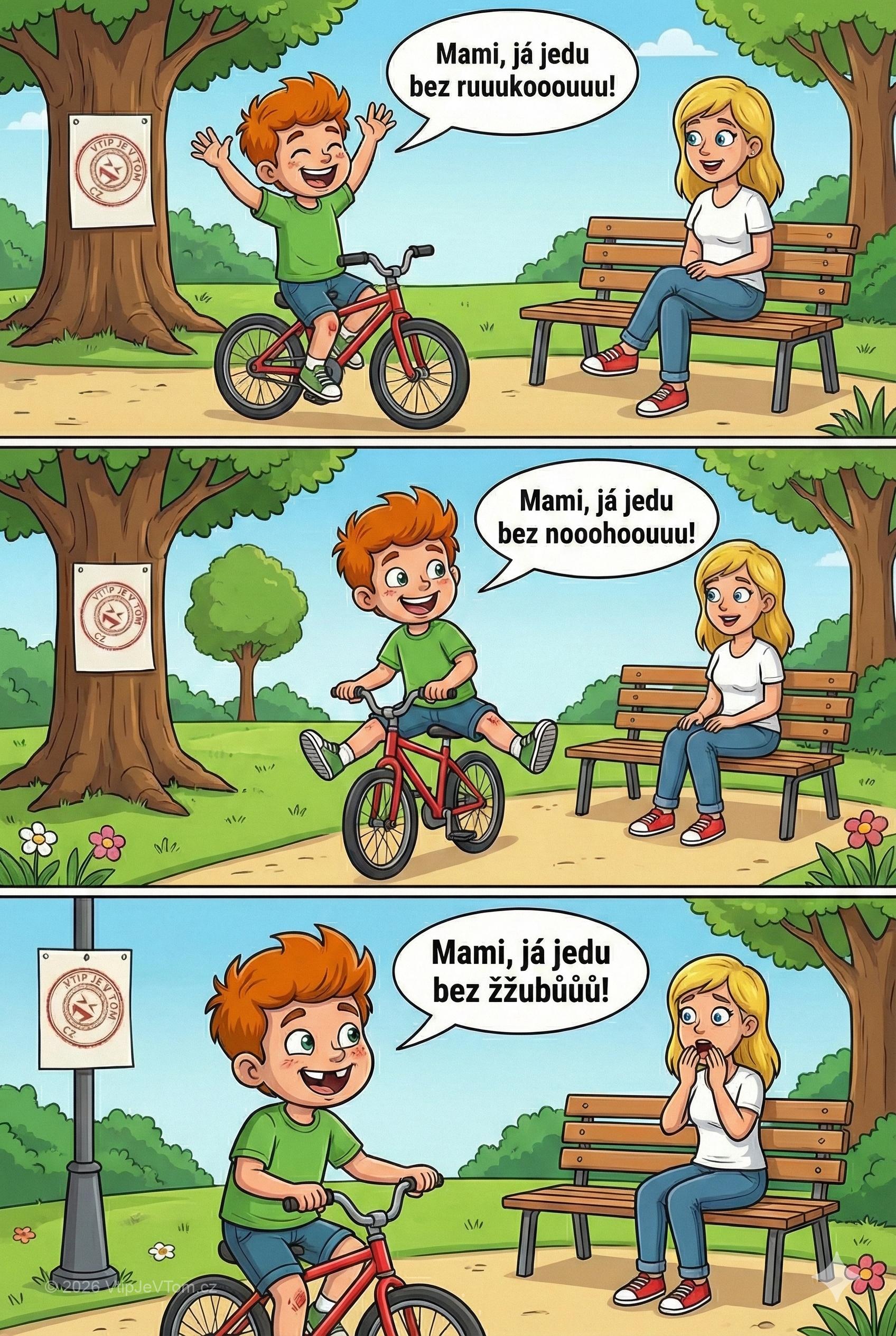 Po chvíli Pepíček jede zase kolem a nohy drží roztažené do stran: „Mami, já jedu bez nooohooouuu!“