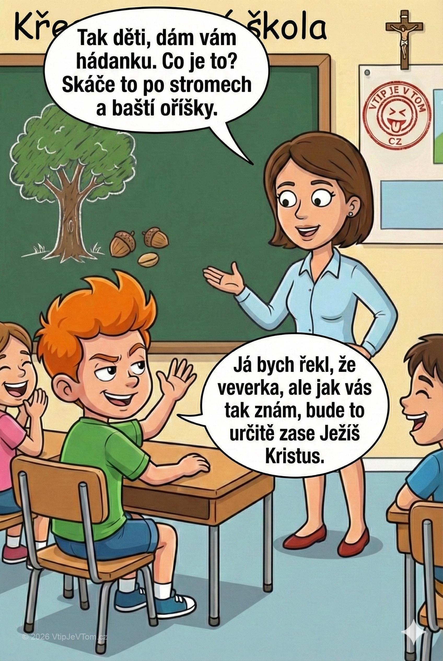 Přihlásí se Pepíček: „Já bych řekl, že veverka, ale jak vás tak znám, bude to určitě zase Ježíš Kristus.“