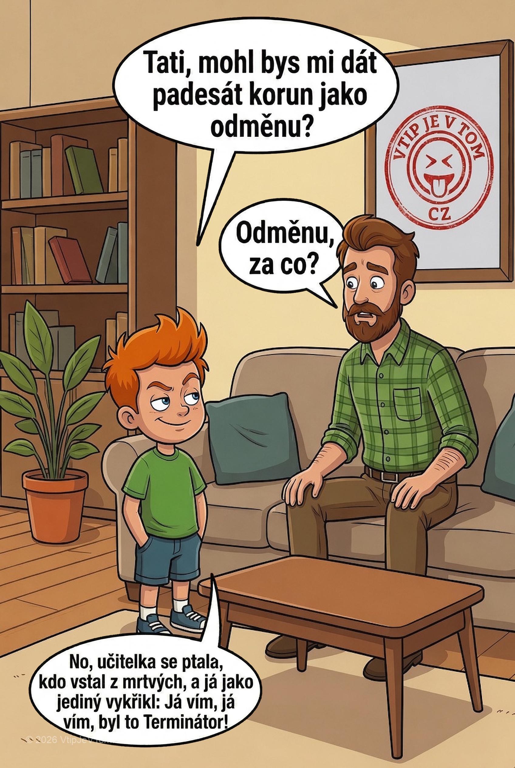 Pepíček: „No, učitelka se ptala, kdo vstal z mrtvých, a já jako jediný vykřikl: Já vím, já vím, byl to Terminátor!“