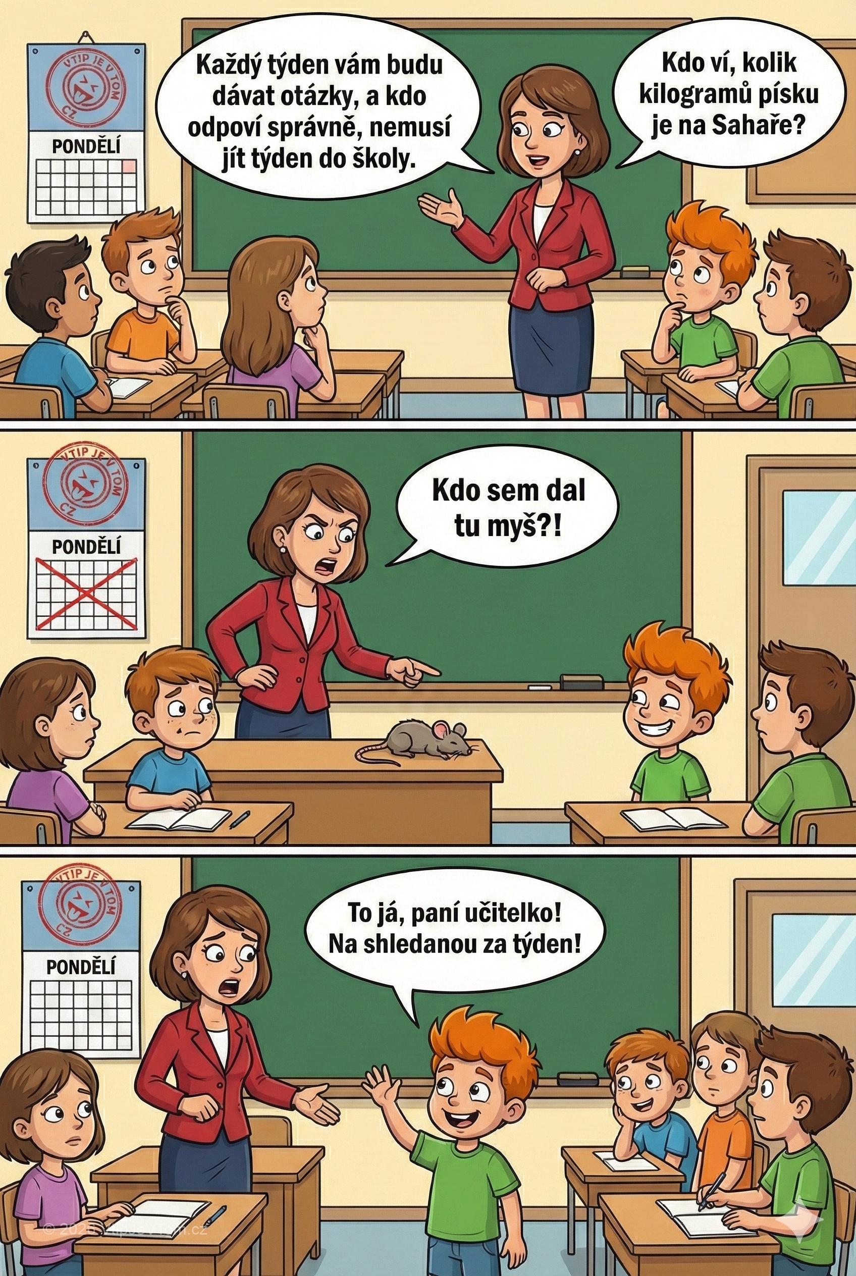 Za týden přijde do třídy a na stole vidí mrtvou myš. Hned se zeptá: „Kdo sem dal tu myš?!“