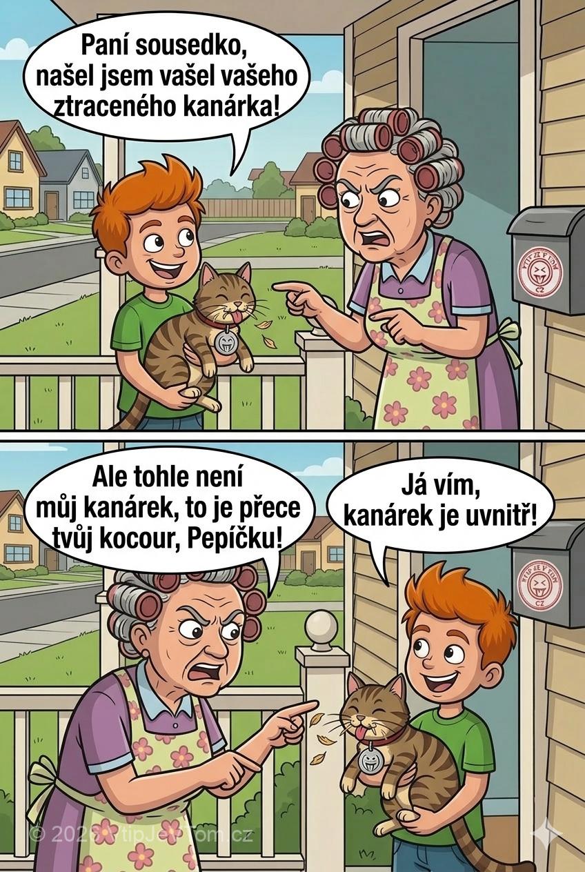 Pepíček zazvoní u sousedů: „Paní sousedko, našel jsem vašeho ztraceného kanárka!“