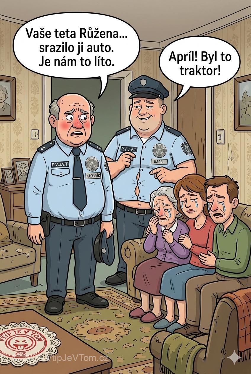 Všichni pláčí a hořekují a vtom Karel povídá: „Apríl, byl to traktor!”
