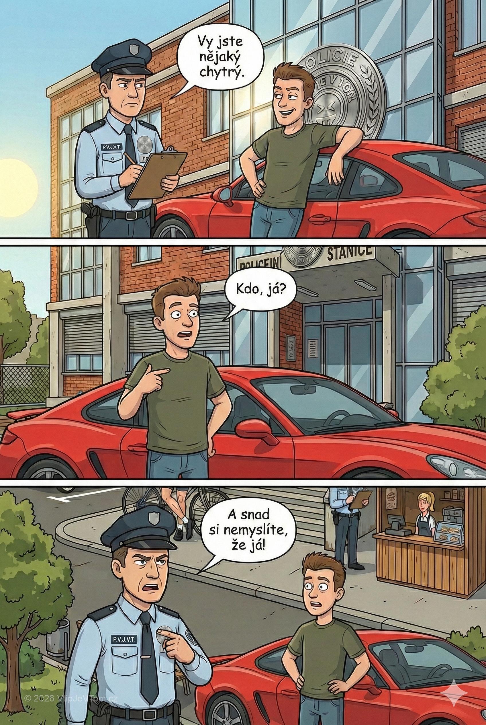 Dopravní policista Franta se k řidiči, nesouhlasícímu s pokutou: „Vy jste nějaký chytrý.”